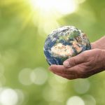 Close up of senior hands giving small planet earth to a child |