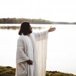 Shallow focus shot of Jesus Christ with his hands up and looking in the distance |