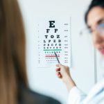 Beautiful female optician doing eye test with eye chart on her patient in ophthalmology clinic |