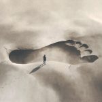 9948 Illustration of a little man following huge footprints in the sand, surreal concept