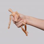 9950 A narcissistic parent. A wooden mannequin in the hand of an adult who tortures and abuses her. Metaphor with domestic violence isolated on gray background.