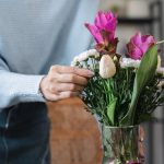 9952 Woman Arranging Fresh Flowers in a Vase at Home, Creating a Beautiful Floral Display in a Cozy Living Space