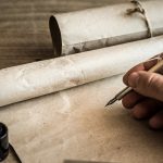 9938 Hand writing with old quill pen on the old paper. Historical atmosphere. Empty place for a text.